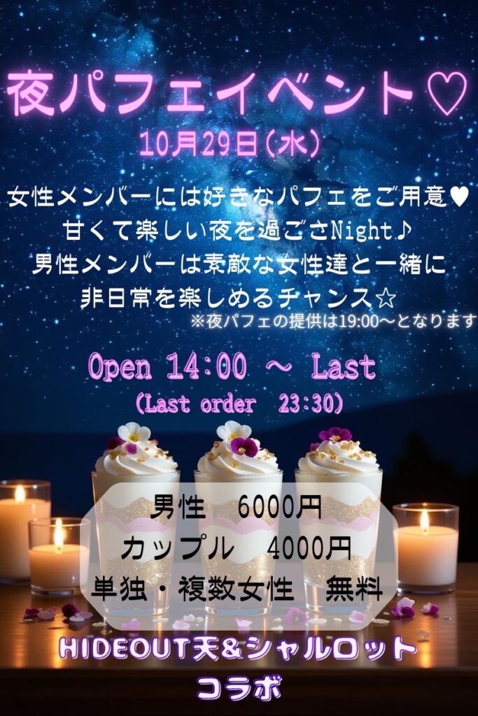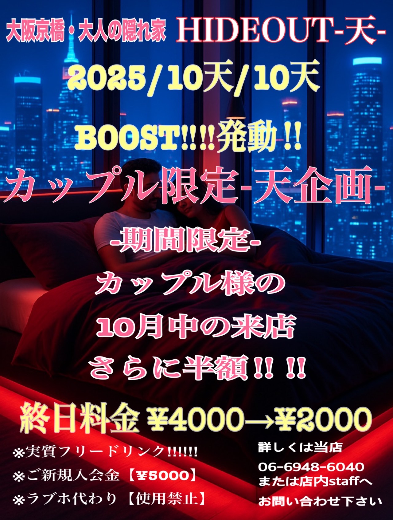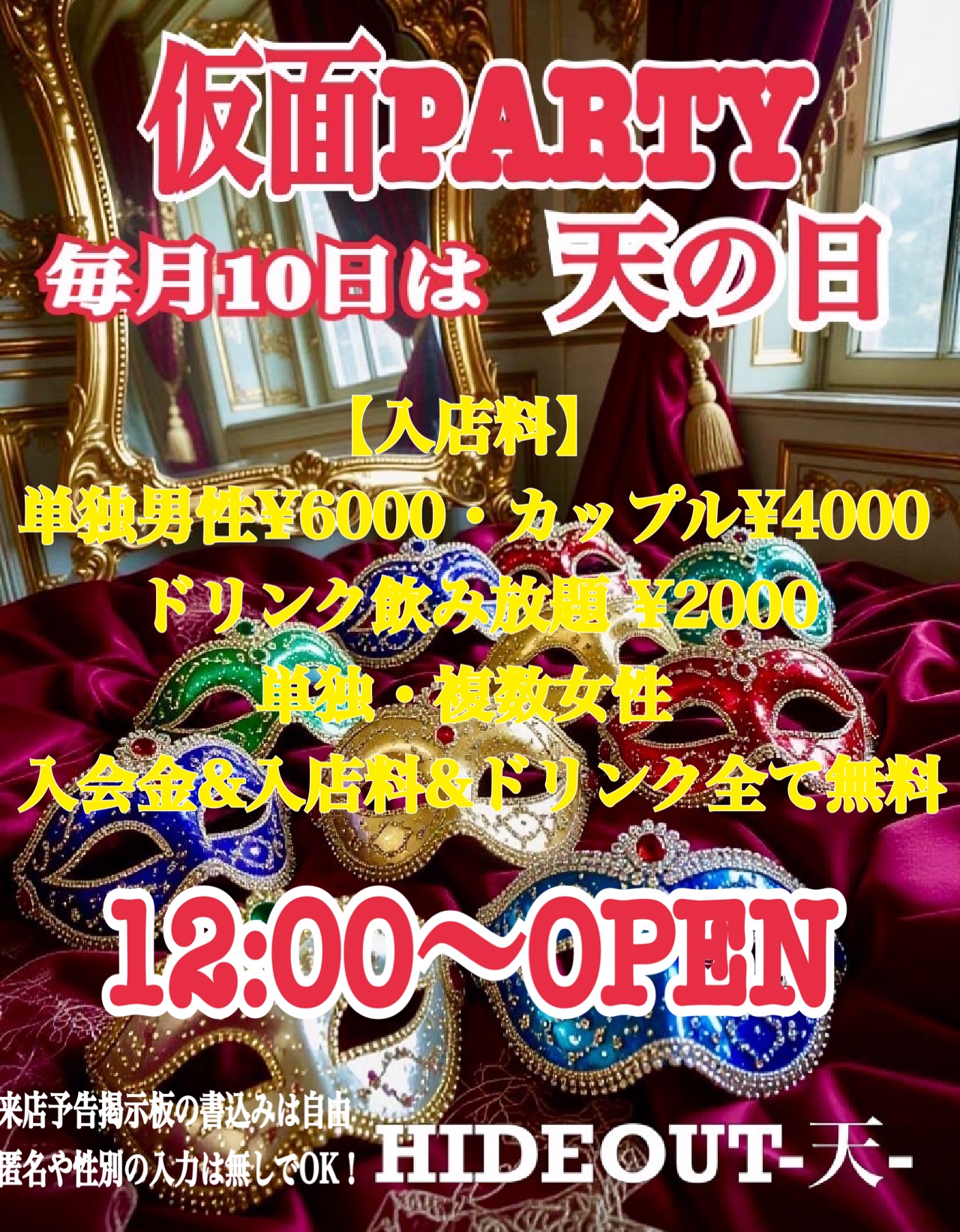 【HIDEOUT 天 -TEN-】は日常から非日常の時間にスイッチを切り替え、それぞれの嗜好や性癖など心の中に秘めた全てを解放できる大人の隠れ家です。女性が安心して楽しめるようプライバシーを重視し清潔で安全な空間づくりを心がけております。みなさまにより一層素敵なお時間を過ごしていただくために、男性様にはまず一番に女性の気持ちを尊重したマナー、接し方を大切にしていただくようお願いしております。